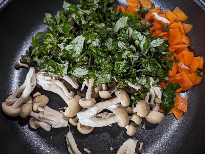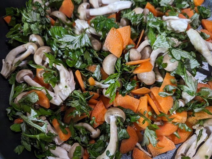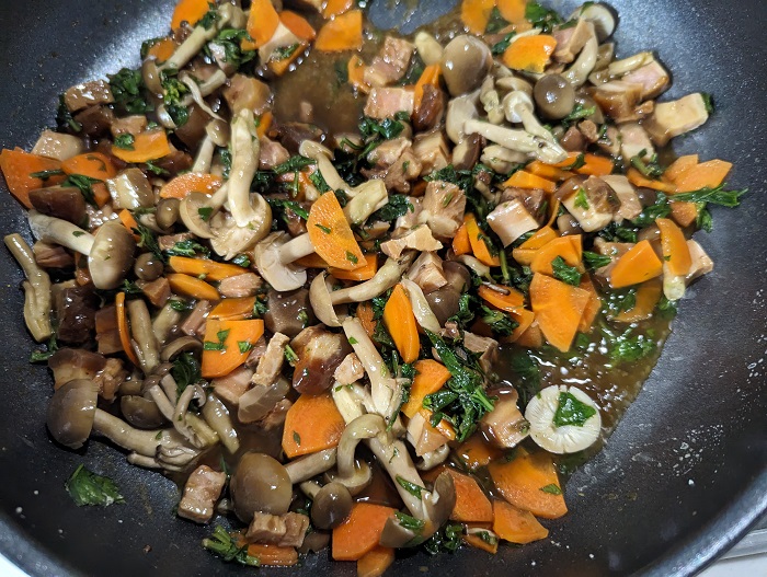 人参、しめじ、蓬を適当な大きさに切って炒める。