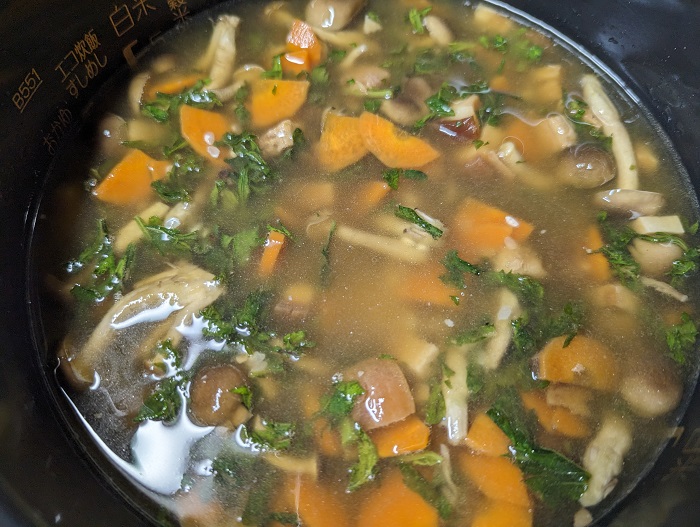 炊飯器にお米と水を少なめにセットし、炒めた具材を汁ごと入れて炊飯。